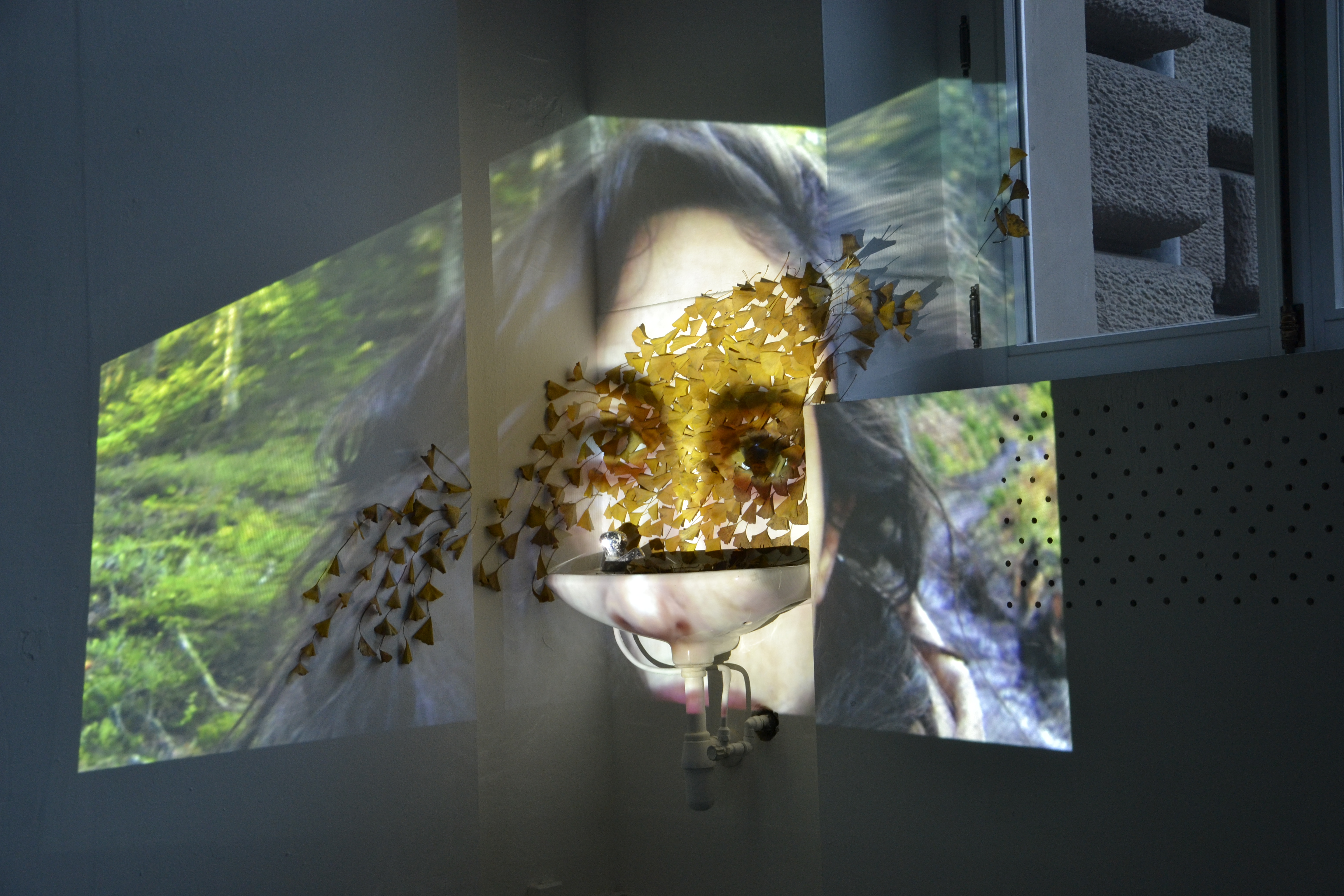 Installation vidéo, feuilles de Ginkgo biloba, projection sur lavabo, son. Dimensions variables. Durée de la vidéo : 2 minutes en boucle.